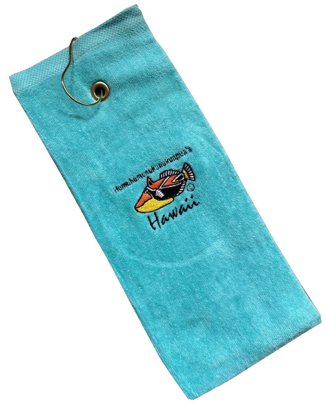 26” x 15” Aqua, cotton velour golf towel with grommet and hook, embroidered with original and exclusive Pacific Links Golf "Humuhumunukunukuapua'a" (Reef Trigger Fish - the Hawaii State Fish) logo in Orange, Black and Yellow.
